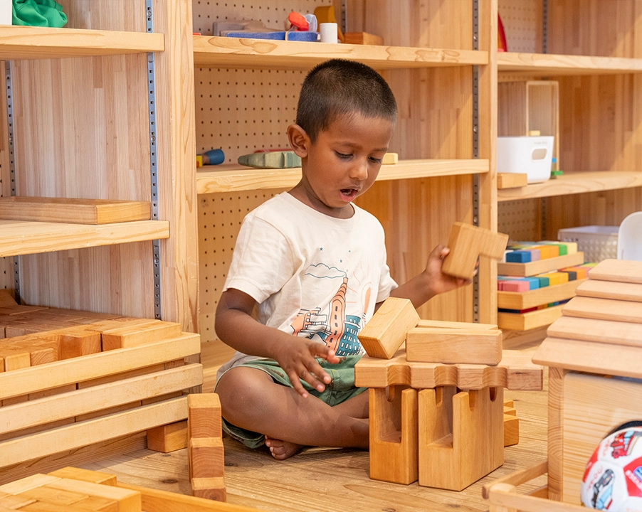 また、スクール内の一室には、子どもたちの背丈に合わせた「子どもキッチン」を設置。小さいうちから料理や片付けに接することで、食の大切さを学び、大人任せにせず自分でやってみる姿勢を育みます。