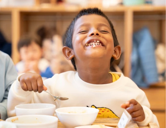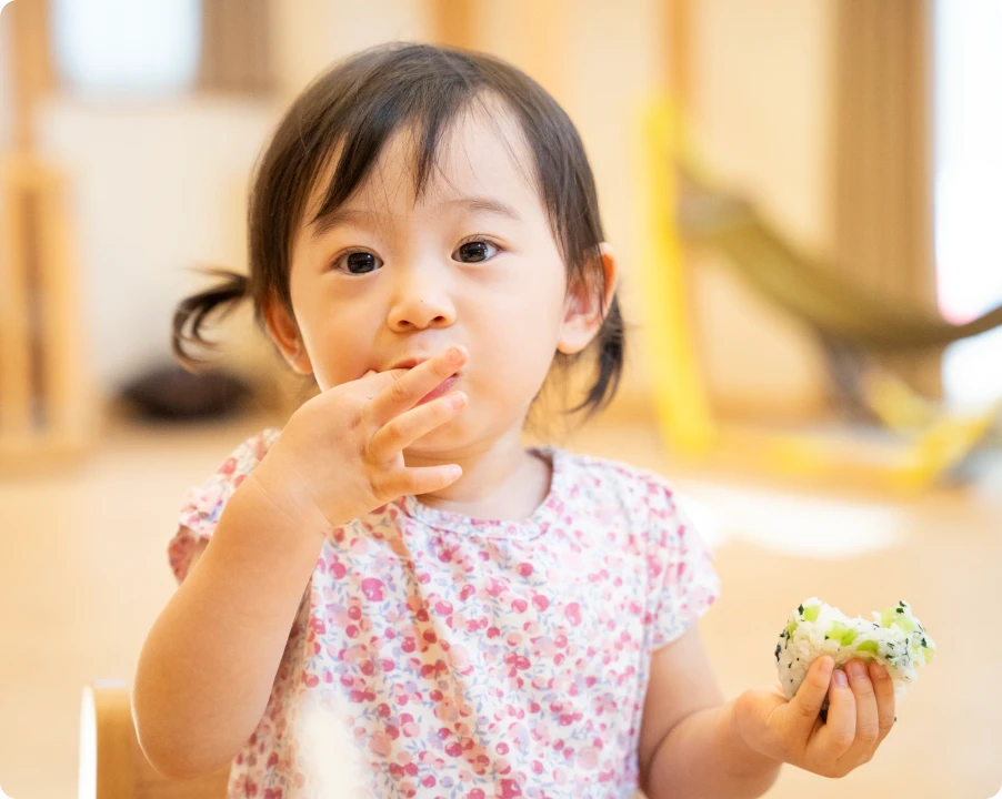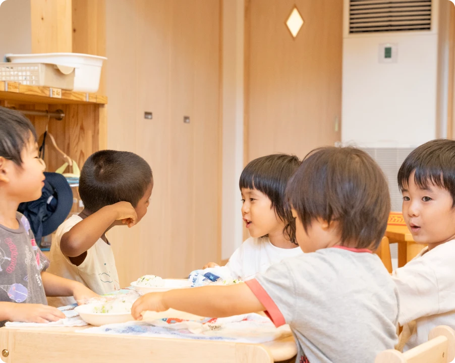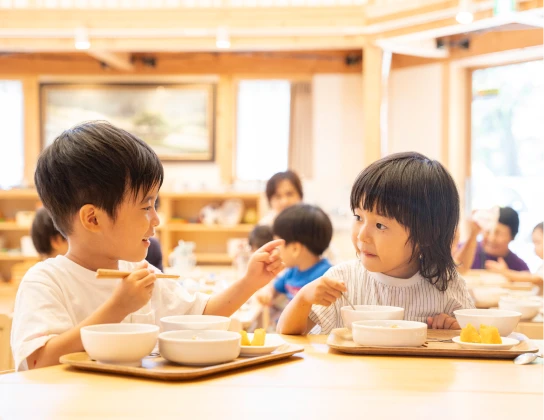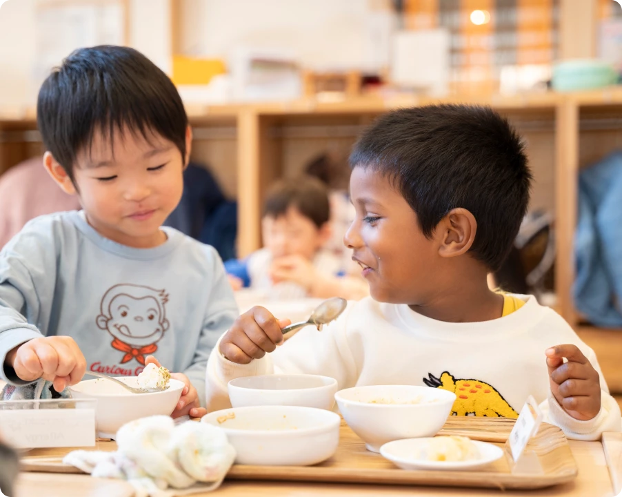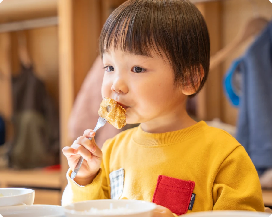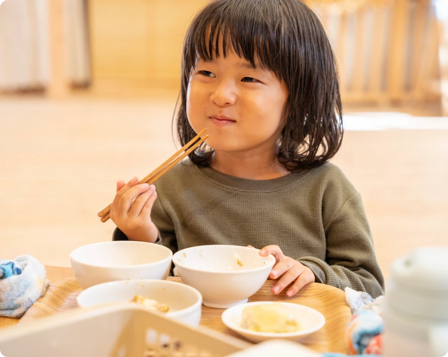 そして、子どもたちの心と体をつくる食育も当園の大きな特色です。安全な素材を使ったミネラルオーガニック給食に加え、園舎には子ども用キッチンを設け、簡単な調理や、調理後の片付けまでを一連の体験として学ぶことができます。自分で作り、片付けるという過程は、食への興味や主体性を育てる大切な学びです。