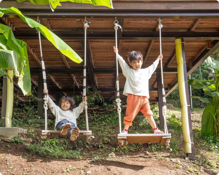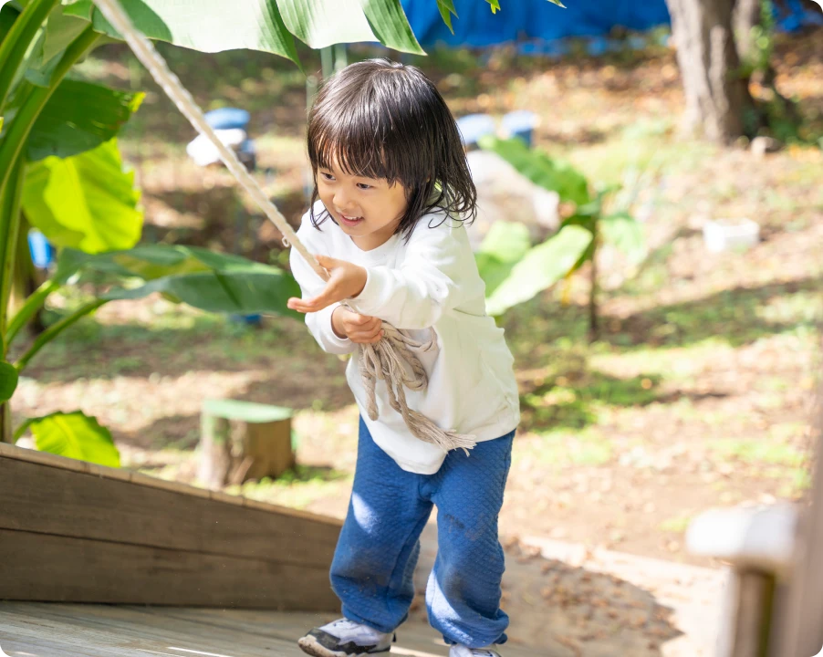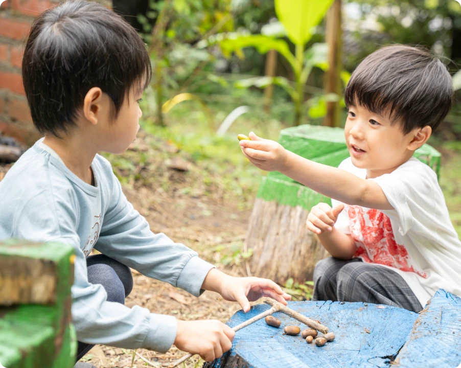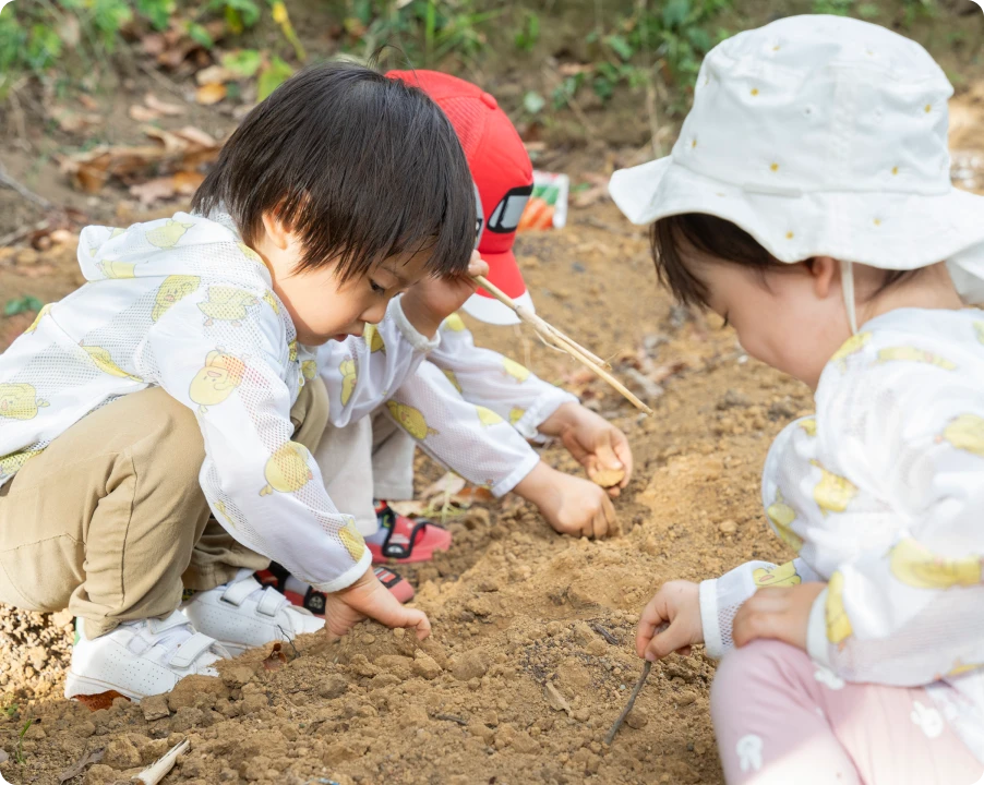 さまざまな生きものと五感をいっぱいに使ってふれあい、ときにはどろんこまみれになって遊びながら、命の大切さを学び、健康な体を育みます。
