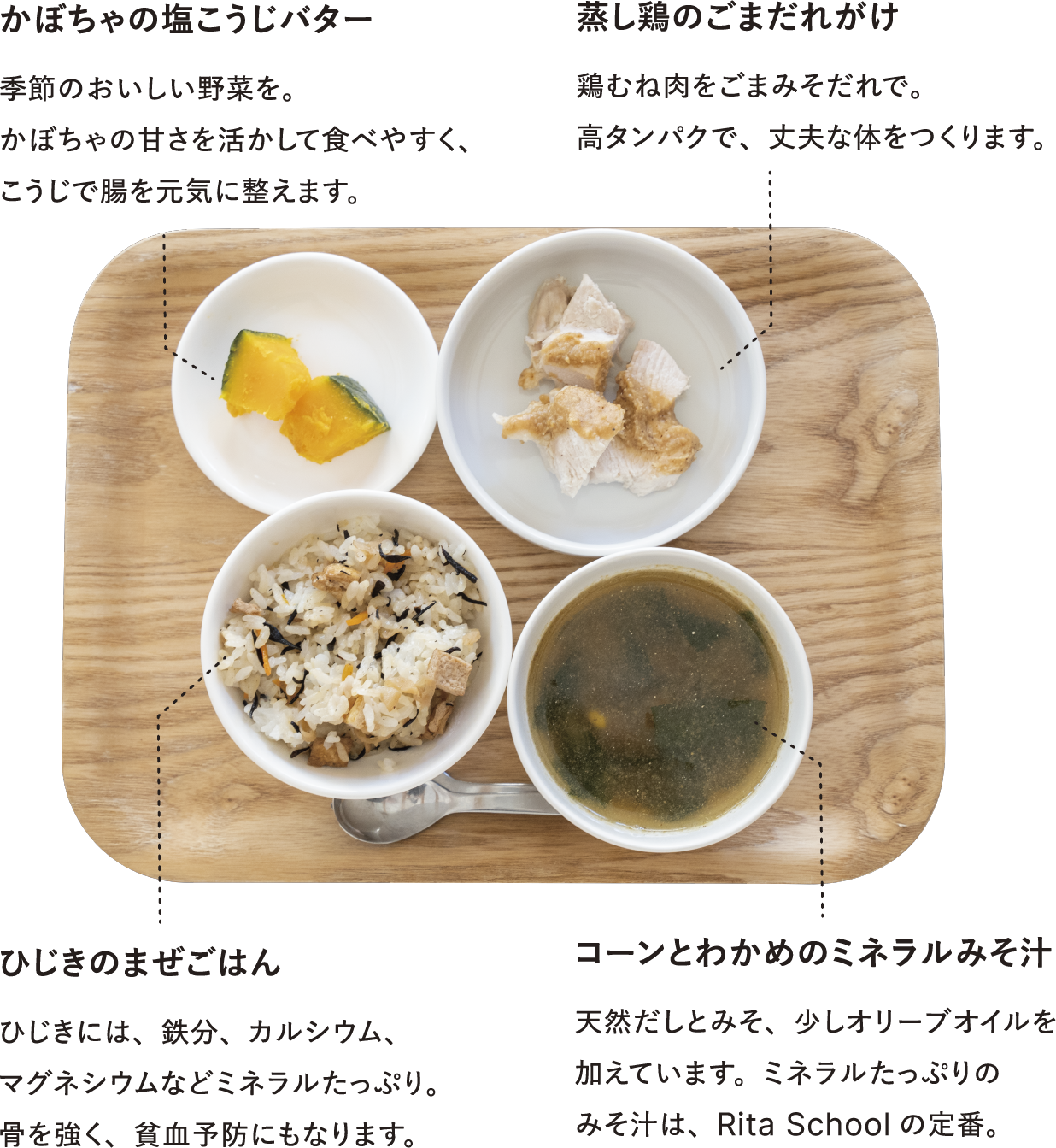 当スクールは、ミネラル・オーガニックに詳しい国光美佳先生監修のもと、砂糖や小麦、乳製品などの食材を極力避けた、心と体にやさしい食事を提供しています。